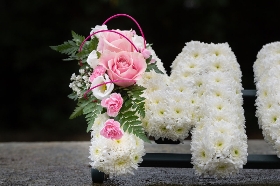 Classic double-white chrysanthemum based lettering with a choice of colour trim .
