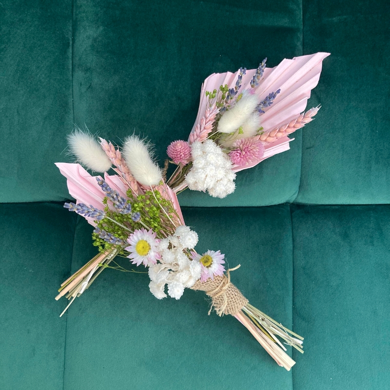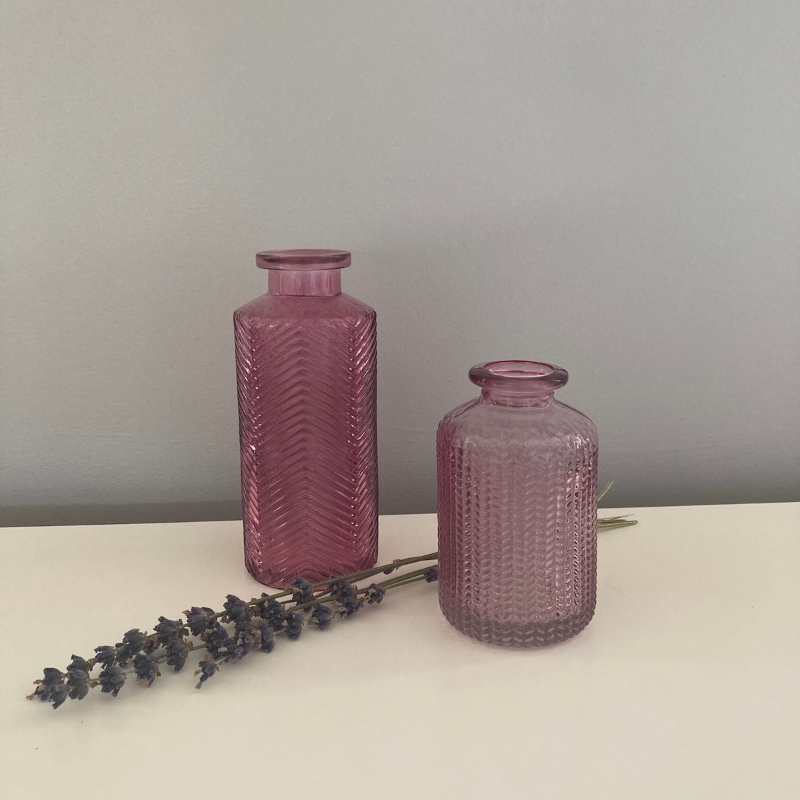 Shades of pretty pinks lovingly arranged in two dark pink chevron embossed glass vases. Finished off with two fans for a vintage style.