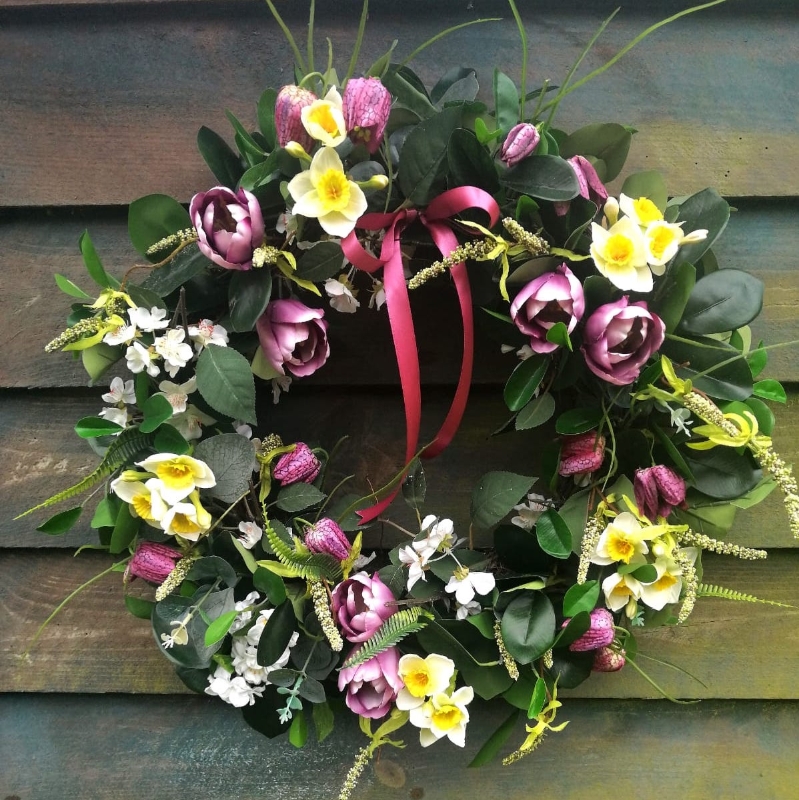 To carry you through the last dark days of winter and  into the Spring  and Easter, our natural style artificial wreath in a mix of spring flowers will brighten any door and make a statement.  Each one is handmade and different but all are top quality.